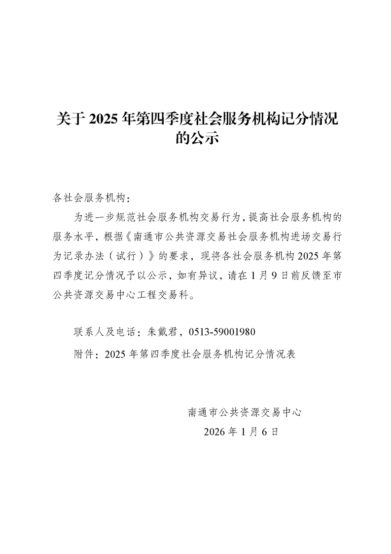 关于2025年第四季度社会服务机构记分情况的公示